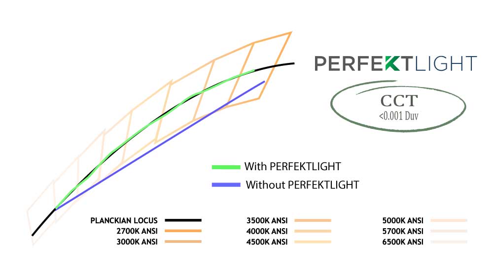 Correlated Color Temperature (CCT): Two different LEDs can be listed as the same CCT but look very different. Color inconsistency as a result of this chromaticity drift away from the Blackbody Locus (BBL) presents a problem for lighting designers. Because tunable white chromaticity tracks underneath the BBL (see graph), PERFEKTLIGHT™ is able to use green light to shift chromaticity up and eliminate hue error for incredibility accurate white color from 2700K to 6500K.
