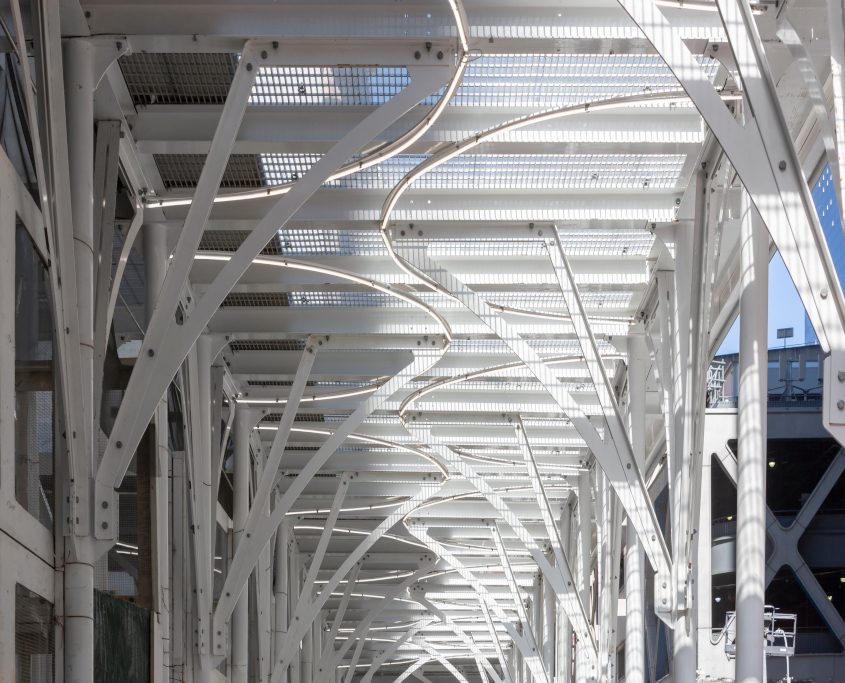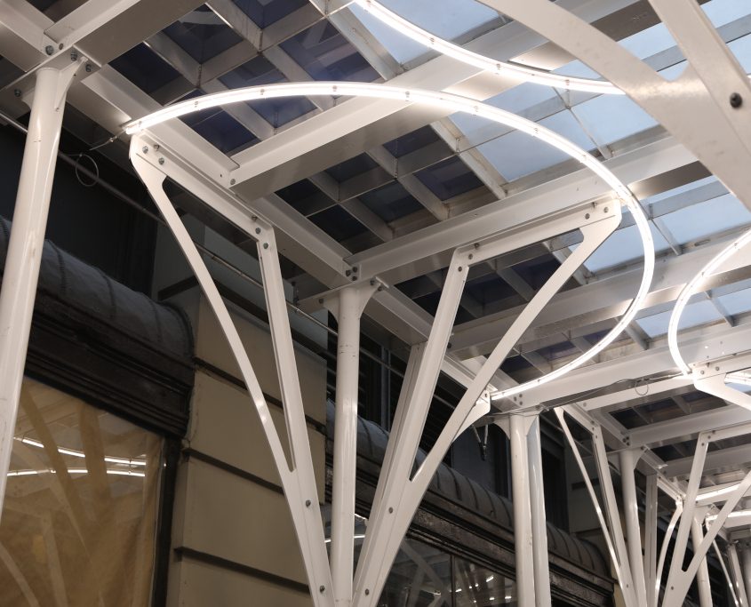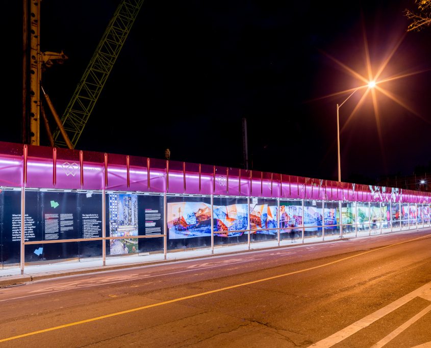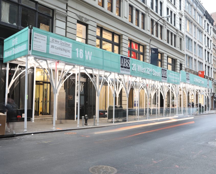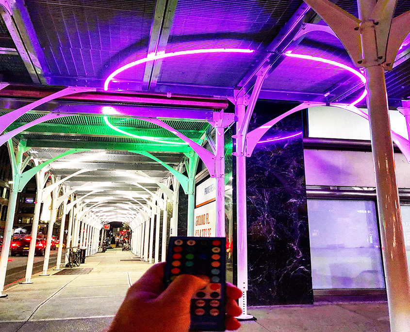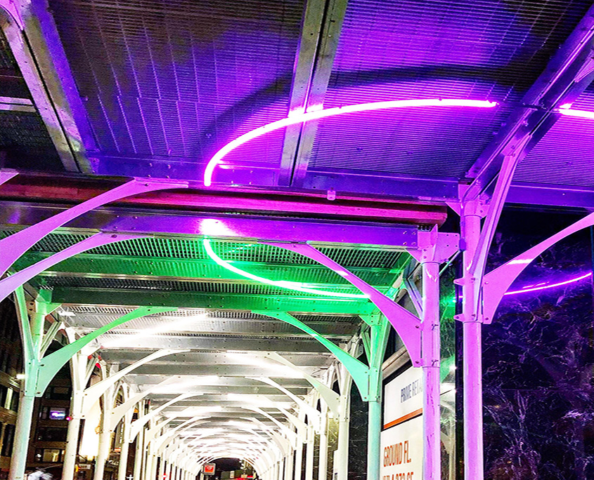 Urban Umbrella transforms construction riddled sidewalks into safe, welcoming pedestrian corridors, while giving building owners and developers an aesthetically pleasing option. Utilizing Profile Series Contour mounted with clips to form radius illumination mounting, the fixtures are able to form a radius illumination on the curved custom designed brackets of the scaffolding shed.
